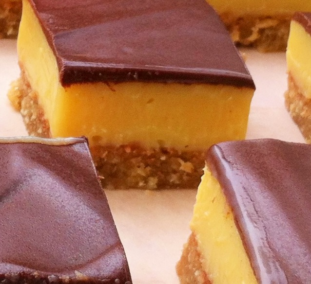 GREASE and line a 25cm square baking dish with deep sides. Ensure that baking paper extends over the sides of the dish for easy removal of the slice.