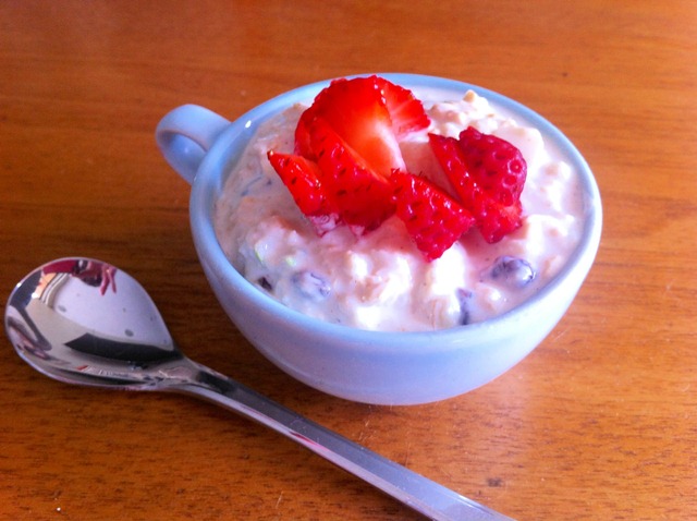My home-made version consists of rolled oats, lemon juice, yoghurt, honey, fresh fruit and nuts, and is surprisingly easy to prepare. Simply soak your oats with any dried fruit and nuts you are using in apple or orange juice overnight. In the morning add yoghurt, coarsely grated apple and seasonal fruit. You can use any combination of fruit and nuts. Use just enough lemon to balance the sharpness of the yoghurt. Double the recipe to make enough for several days’ breakfasts – it tastes even better after a little time in the fridge.