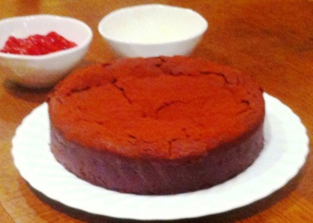 Rich and Decadent. Whiskey, Chocolate and Hazelnut Cake with Rhubarb Compote and Creme Fraiche
