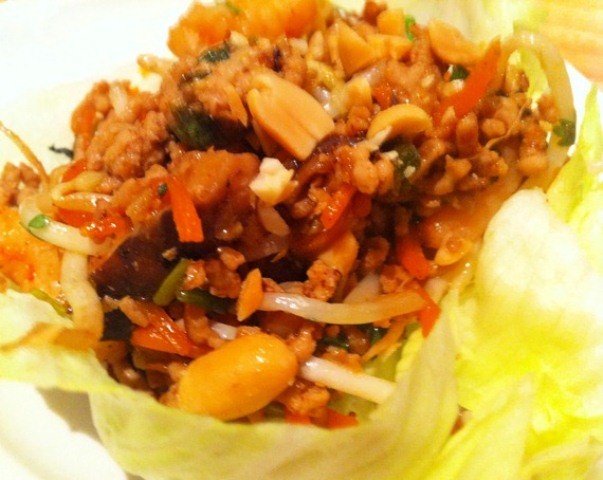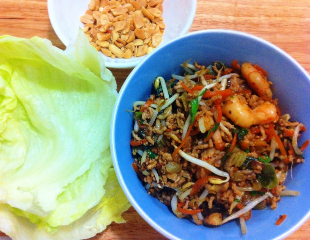 An alternative when entertaining a crowd, is to take a platter of lettuce cups along with separate bowls of San Choi Bau and chopped peanuts to the table and let your guests help themselves.