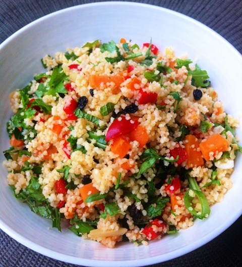 Couscous on its own may be very bland but there is an endless array of vegetable, herb, spice, nut and dried fruit combinations that can be used to impart great flavour to this salad. Look to what’s in season, and in your pantry or refrigerator. There are no hard and fast rules. Be guided by your palate. The only real limit is your imagination.