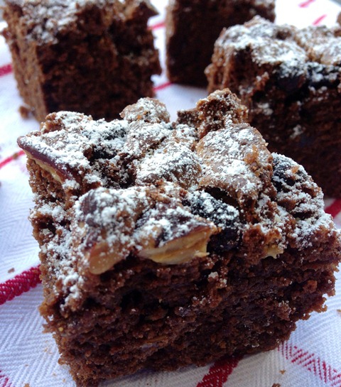 BAKE for 40 – 50 minutes or until an inserted skewer comes out clean. If top appears to be browning too quickly cover with a sheet of foil. Allow to cool slightly in the tin before slicing into squares. Dust with icing sugar.