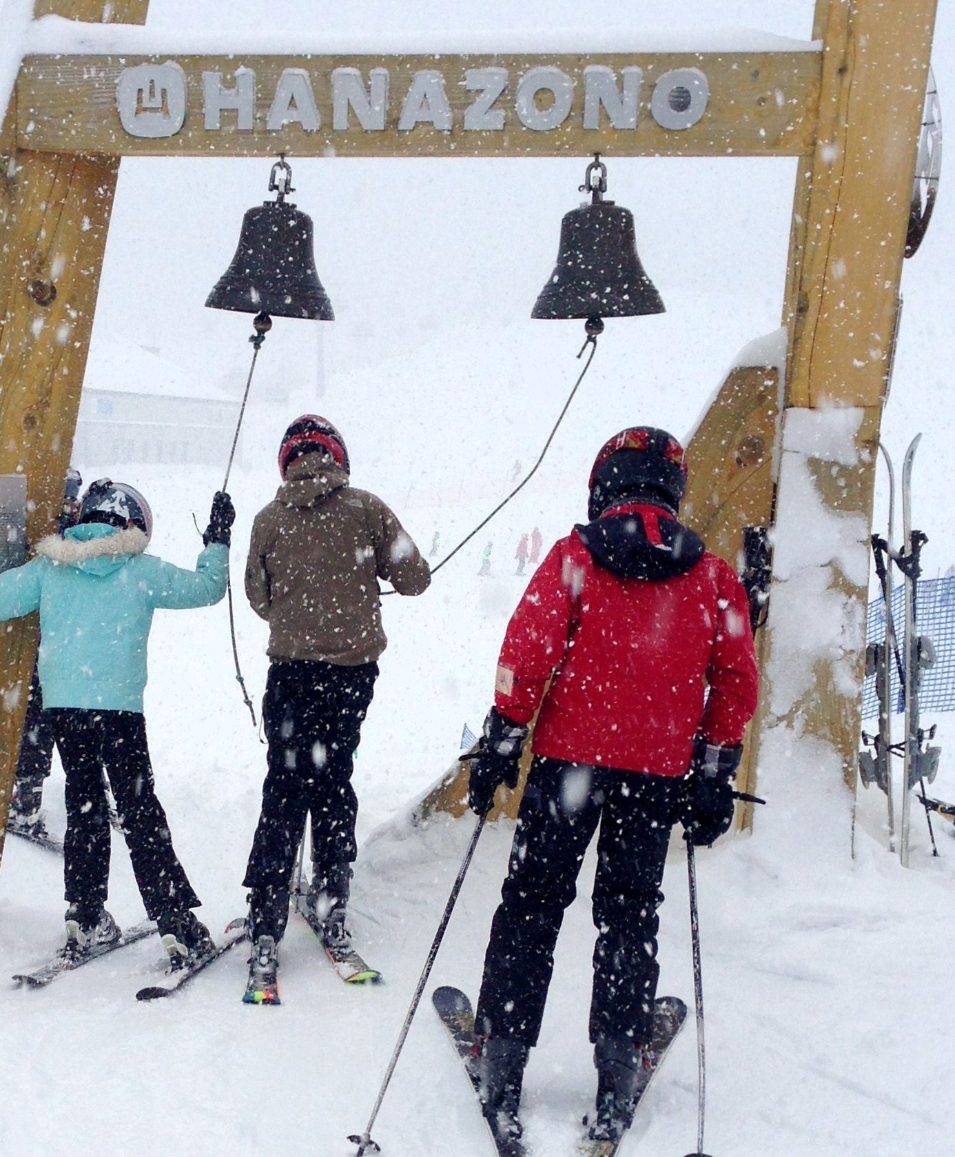 Today we headed out later than usual to Hanazono 308 for their regional specialty. King Crab Ramen. Also known as Kane Ramen in Japanese. Our theory was that the weather would clear later in the day and we would get some blue sky skiing. At least that has seemed to be the pattern over the last five days or so. How wrong we were. No amount of ringing of the Hanazono Happy Bells was going to improve the weather situation this afternoon. I think if anything, the reverse is true, it just brought more snow. And less visibility.