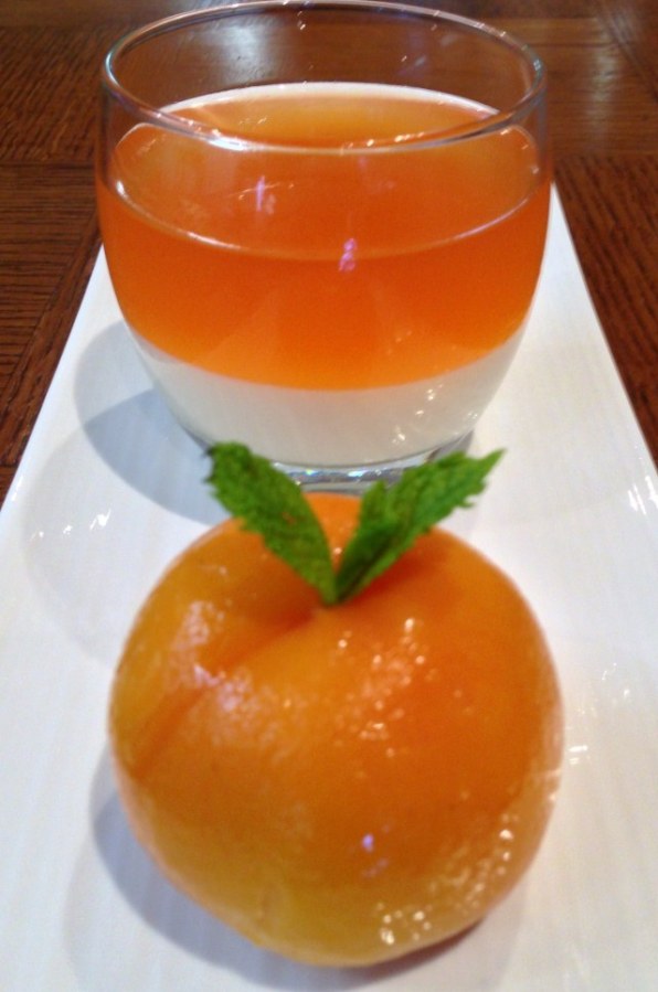 ← A Very Modern Take on a Classic. Prosecco Poached Peaches with an Orange Scented Jelly and Vanilla Panna Cotta Cream.