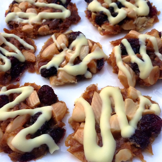 Almond and Cranberry Florentine Drizzled With White Chocolate