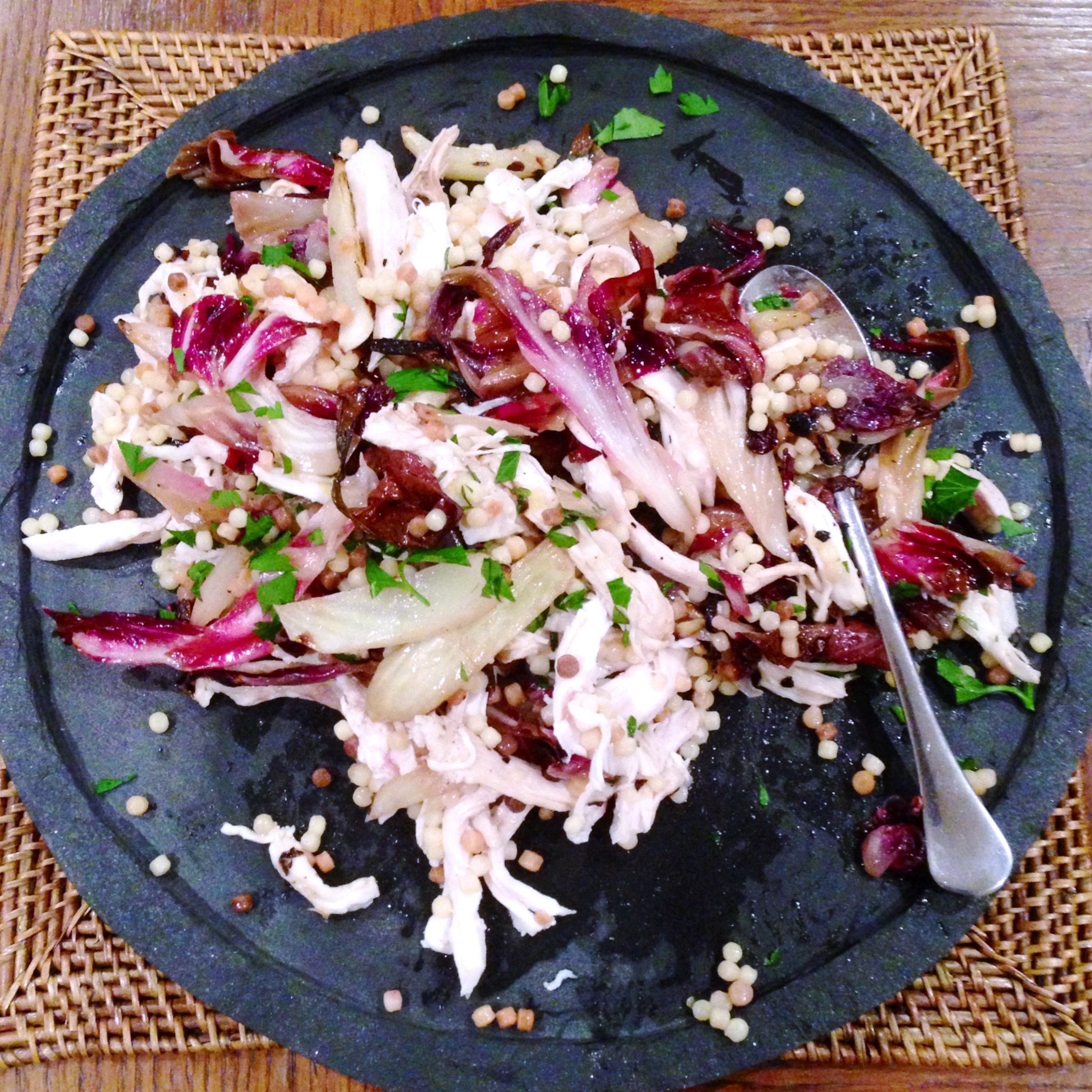 ← Eat, Fast and Live Longer. A 5-2 Fast Diet Meal Idea Under 400 Calories. Warm Chicken And Fregola Salad With Charred Radicchio and Fennel.