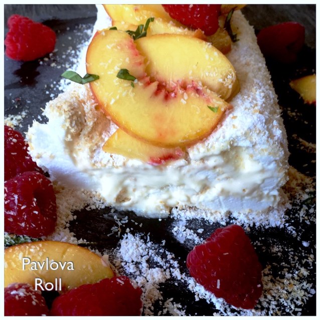 Pavlova Roll With Lemon Curd, Peaches, Raspberries And Coconut